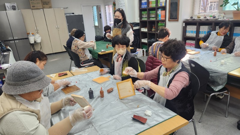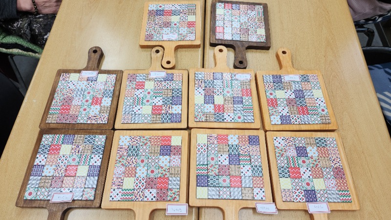 경남조은장애인평생학교 학생들은 1교시 미술심리치료 시간 후 2교시 목공예 시간에 우드로 냄비받침 만들기를 해보았습니다. 먼저 손잡이가 달린 나무판을 사포로 부드럽게 갈아주었습니다. 부들부들해진 나무판 위에 스폰지로 연한색 또는 진한색을 입혀줍니다. 그런다음 크림으로 코팅을 해주었습니다. 타일을 하나씩 뜯어보고 그 위에 목공예 풀을 이용하여 하나씩 타일을 붙혀서 완성시켜주었습니다. 완성하고 보니 너무나 실용적인 냄비받침이 완성되었네요. 재밌고 유익한 시간이었습니다.