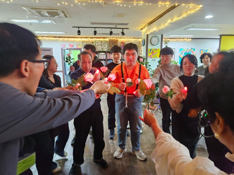 함께 모여진 꽃들이 발달장애인 모두가 "켜져랴" 며 마술을 펼치자 불이켜지며 꽃이 피어난다.