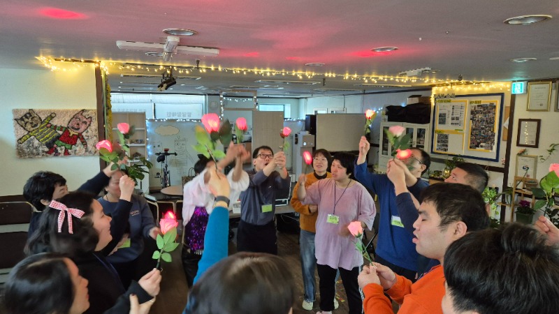 발달장애인 모두가 불이켜진 꽃을 한꺼번에 들어 보이며 자랑한다.