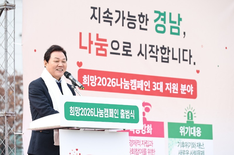 경상남도(도지사 박완수)는 12월 1일 오전, 창원시청 광장에서 ‘희망2026 나눔캠페인’ 출범식 및 사랑의 온도탑 제막식을 개최하고, 내년 1월 31일까지 2개월간 연말연시 집중 모금에 나선다. 목표액은 106억 7천만 원이다.