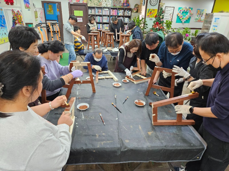 발달장애인 이용자들이 의자틀에 색을 칠하고 말리며 다시 칠하길 반복하며 정성을 다한다.