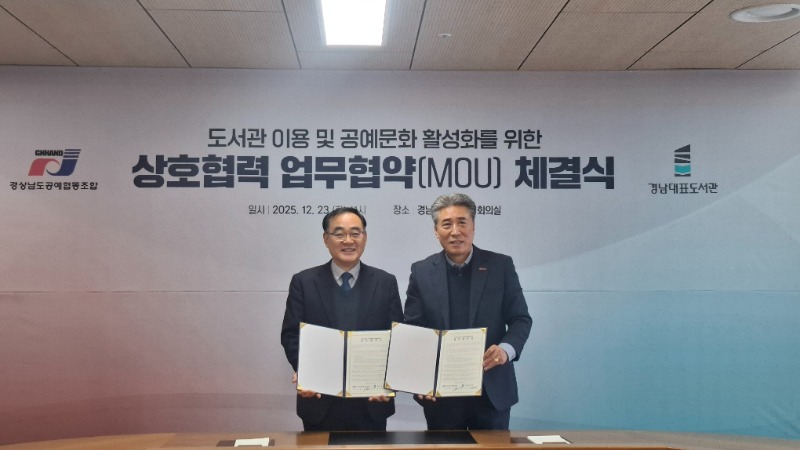 경남대표도서관(관장 강순익)은 23일 오전 11시 경남대표도서관 회의실에서 경상남도공예협동조합(이사장 허일)과 도민의 공예문화 향유 기회 확대 및 도서관 이용 활성화를 위한 업무협약을 맺었다고 밝혔다.
