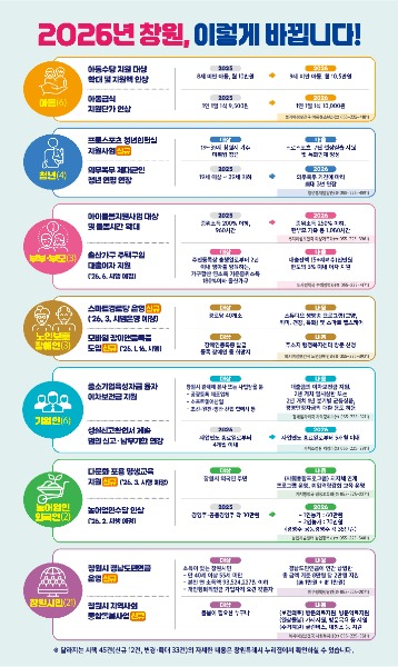 한편, 「2026년 달라지는 시책」 책자는 각 읍·면·동 행정복지센터 민원대에 비치될 예정이며, 전자책(e-book) 형태로도 발간돼 창원시 홈페이지(시정소식→주요시정→2026년 달라지는 시책)에서 세부내용을 확인할 수 있다.