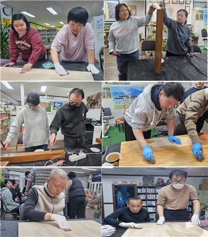 뜨레봄의 발달장애인들은 목재판을 문지르며 색을 칠하는 DIY체험 활동을 하였다.