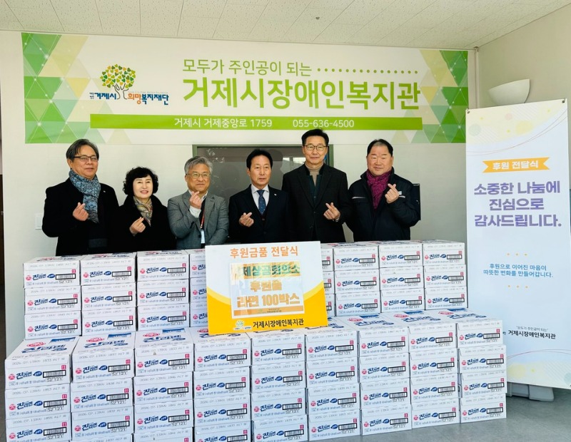 거제시장애인복지관(관장 우성기)은 2026년 2월 9일 거제상공회의소(회장 김점수)로부터 라면 100박스를 후원받았다.