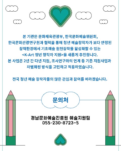 정영철 도 문화체육국장은 “‘K-Art 청년 창작자 지원 사업’이 경남 지역 청년 예술인들의 생계 부담을 덜고, 창작 활동에 온전히 집중할 수 있는 든든한 기반이 되길 바란다”며, “다년도 지원 체계를 통해 안정적인 창작 환경을 조성하고, 지역 예술 생태계의 자생력을 높이는 계기가 될 수 있도록 적극 지원하겠다”고 밝혔다.
