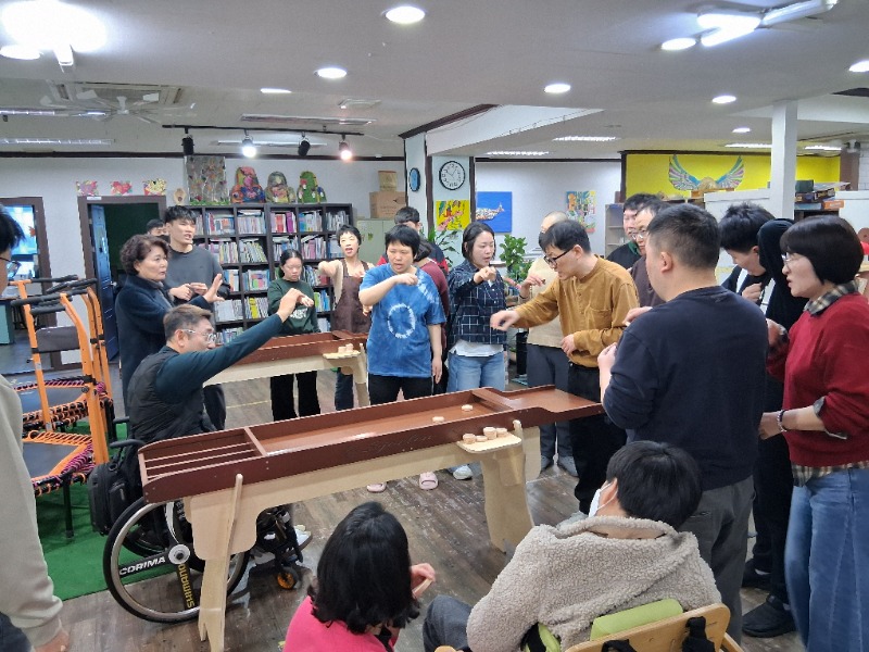 발달장애인들은 슐런게임을 처음 접하며 게임요령을 함께 배운다.