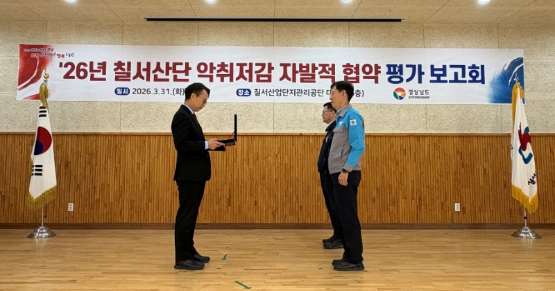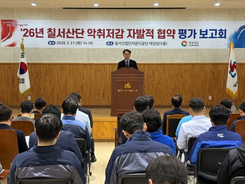 경상남도는 31일 오후 2시, 칠서산단 복지회관 대강당에서 협약 참여기업 관계자와 시군 환경담당 공무원 등 100여 명이 참석한 가운데 ‘칠서산단 악취저감 자발적 협약 2026년('25년 실적) 이행 평가 보고회’를 개최했다고 밝혔다.