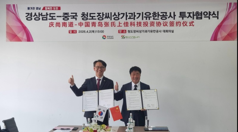 경남도(도지사 박완수)는 2일 중국 산둥성 칭다오시에 위치한 청도장씨상가과기유한공사(이하 장씨상가) 본사에서 경남 도내 자동차 부품 제조시설 투자를 위한 양해각서(MOU)를 체결했다고 밝혔다.
