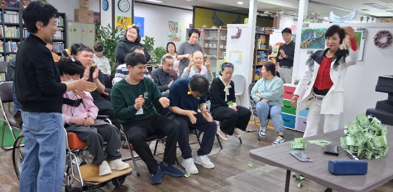 마술사가 지폐를 이용하며 마술을 펼치자 발달장애인들이 커다란 박수를 보낸다