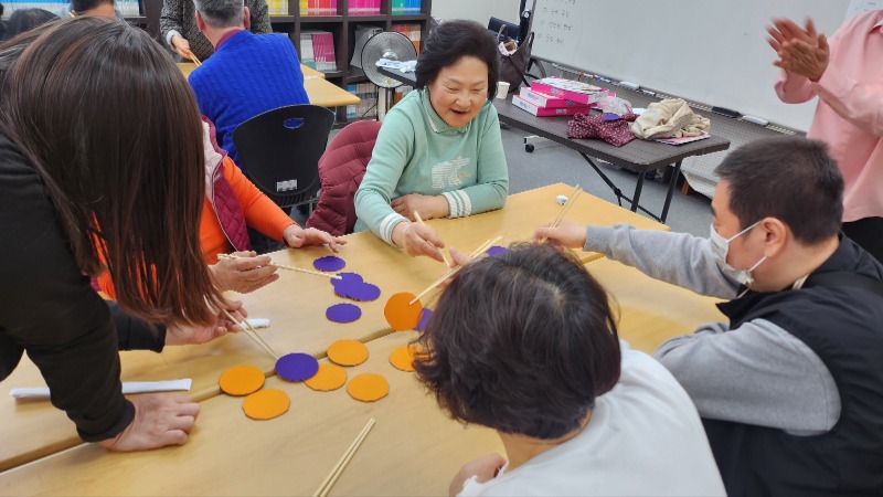 경남조은장애인평생학교 학생들은 뇌인지 발달 시간에 쌍쌍게임을 해보았습니다. 쌍쌍게임은 똑같은 그림을 찾아서 제일 먼저 찾은 사람이 "쌍쌍"하고 외치며 그림을 찾아서 가져가서 많이 가져가는 사람이 이기는 게임입니다. 한 그림판에 여러가지 다양한 그림들이 놓여져 있어서 똑같은 그림을 찾기 위해서는 관찰력, 변별력,집중력, 순발력, 그리고 사물인지와 단기기억을 하여 찾아야 하는 게임으로 많은 집중력이 필요한 게임입니다. 의외로 학생들이 더욱 열의를 가지고 집중해서 게임에 임하는 모습이 사뭇 진지하면서도 너무나 재미가 있었습니다. 말과 웃음이 끊이지 않는 뇌인지발달 프로그램은 인기프로그램이기도 하기에 항상 학생들이 기대하는 수업입니다. 또한 인지활동을 통해 신체운동에도 도움을 주기에 일석이조로 정신과 육체 모두 활용할 수 있는 수업이었습니다.