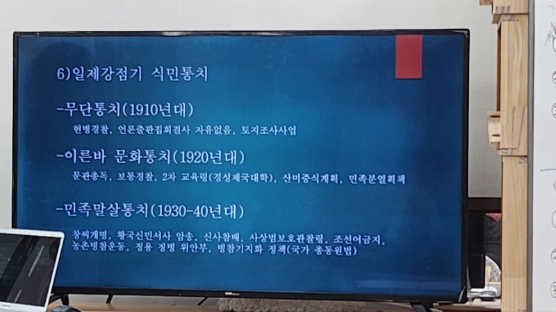 경남조은장애인평생학교 학생들은 역사교실 시간에 <일제강점기> 무단 통치시기(1910년대~), 문화 통치시기(1920년대~), 민족말살 통치시대 (1930년대~1940년대)로 나뉘어 수업을 해보았습니다. 무단통치시기에는 토지조사사업으로 조선이 무지 힘들었고, 문화통치시기에는 산미증식계획으로 우리나라의 쌀을 약탈해 갔으며, 민족말살통치시기는 징병과 징용, 그리고 위안부등으로 조선을 말살하려는 계획이 난무했지만 결과적으로 조선의 독립운동가들이 대한민국 임시정부를 세워, 끝까지 조선을 지키며 목숨을 걸고 나라를 지키려는 숭고한 정신과 단결된 마음, 독립하려는 굳건한 의지와 열의가 지금의 대한민국을 만들었다고 새삼 느끼는 강의였습니다. 이번 강의를 통해 일제강점기의 역사를 제대로 이해할 수 있었고 우리나라의 독립운동가들이 대단함을 다시한번 느끼는 시간이었습니다.
