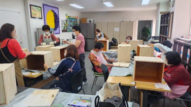 경남조은장애인평생학교 학생들은 목공예 시간에 원목박스 만들기 3차수업으로 형태를 만들어 놓은 원목박스를 전체적으로 물티슈로 닦아내 줍니다. 건조후 400방 사포로 샌딩을 합니다. 샌딩이란 사포로 밀어주는 작업을 말하며, 속면을 제외한 겉면 전체와 문짝까지 샌딩을 꼼꼼이 해 줍니다. 겉면이 조금 부드러워졌다 싶으면 물티슈로 한번 더 먼지를 닦아낸후 말려주고 이번에는 600방 사포로 사방을 샌딩해 줍니다. 600방 사포는 더욱 조밀하여, 밀어주면 원목이 더욱 부드럽고 매끈해지고, 원목이 느낌이 더욱 살아납니다. 오늘은 샌딩하는 작업이 계속적으로 이어지기 때문에 팔도 아프고 조금은 힘든 작업이라 학생들이 지치기도 하였지만 그래도 자신의 원목박스를 완성해 간다는 뿌듯함에 참고 열심히 작업하는 모습이 너무 보기 좋았습니다.