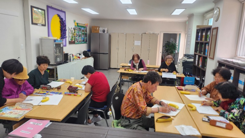경남조은장애인평생학교 학생들은 미술스케치로 직접보고 그리는 시간을 가져보았습니다. 실물 바나나를 이용하여 실제크기로 그림을 그려보았습니다. 바나나를 잘 관찰하며 하나하나 그림을 그려나가는 학생들입니다. 바나나의 생김새를 둥글게 먼저 그리기보다는 일단은 네모모양의 직사각형을 만들어 큰 틀을 잡은 후 그 안에서 바나나의 형태를 잡아보았습니다. 바나나의 곡선의 형태를 천천히 따라 그리며 바나나를 완성시켜보았습니다. 그 다음 색연필을 이용하여 바나나의 색을 입혀주었더니 실물과 닮은 바나나 스케치가 완성되었습니다. 우리가 흔히 자주 먹는 바나나를 이용하여 스케치를 해보니 훨씬 더 재밌고 즐거웠던 시간이었습니다.