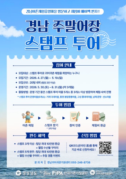 또한, 마을별 3회 이상 스탬프 투어를 완료한 팀에게는 팀당 최대 10만 원의 체험비를 지원하고, 경남 어촌 특화 상품도 별도 제공할 예정이다.